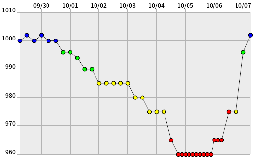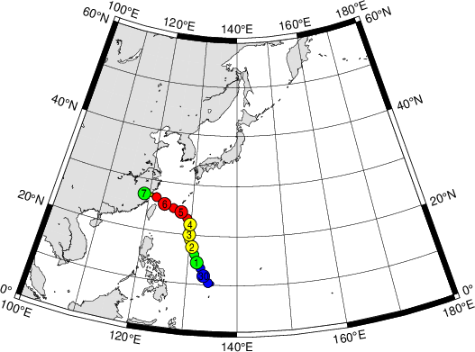 デジタル台風:台風201323号 (FITOW) - 総合情報(気圧・経路図)